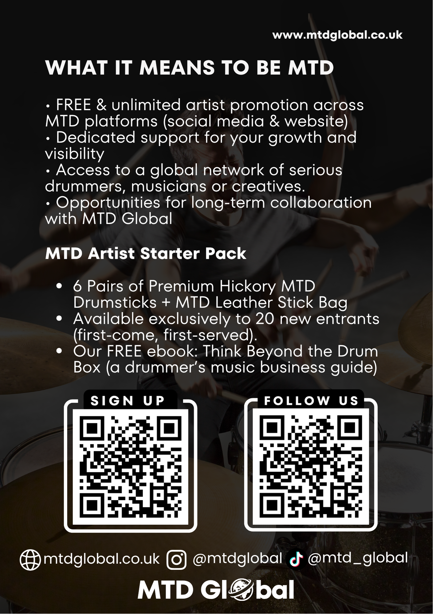 Sign Up Here Minimum requirements:Be active on social mediaA minimum purchase of one pack (6 pairs) of MTD drumsticks I agree that my submitted data is being collected and stored safely to process my request..